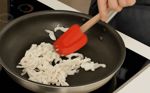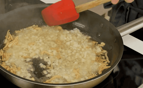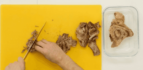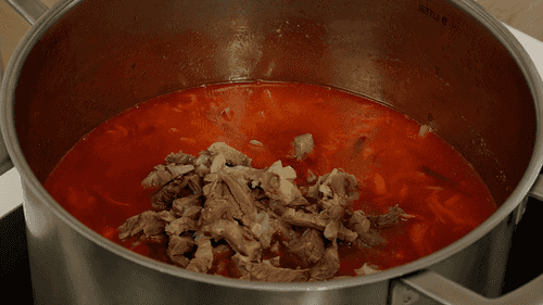 Процедить бульон, мясо нарезать небольшим кубиком, а бульон вернуть на плиту и довести до кипения.