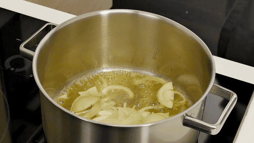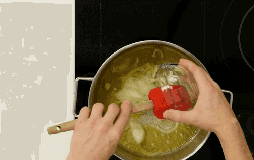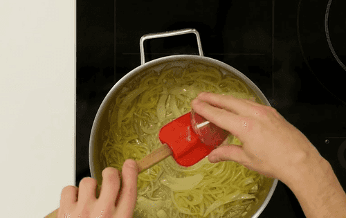 В сотейнике разогреть сливочное и оливковое масло. Обжарить лук, нарезанный тонкой соломкой, до момента, когда он станет прозрачным.