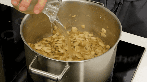 Добавить вино, выпарить в течение минуты, затем влить бульон, довести до кипения и варить 15 минут.