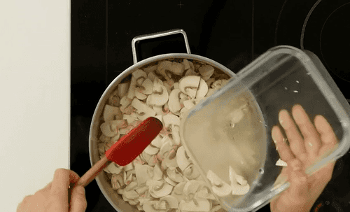 Добавить грибы, нарезанные произвольно, готовить, помешивая, пока они не выделят влагу.