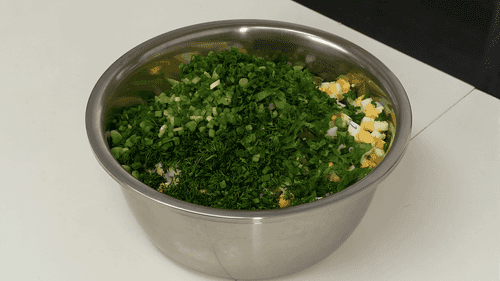 Выложить окрошку в порционные тарелки, посолить и поперчить по вкусу, залить квасом.