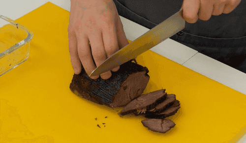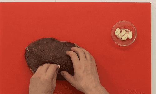 Зубчики чеснока разрезать пополам вдоль, извлечь из них зеленые ростки, если они есть. В куске говядины сделать надрезы и вложить в них чеснок. Посолить и поперчить мясо со всех сторон, обернуть его фольгой и отправить в духовку, разогретую до 180 градусов, на 1,5–2 часа. Затем дать ему остыть.