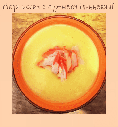 Разлить по супницам, добавить в центр супа рубленое крабовое мясо, посыпать сверху тыквенными семечками по вкусу.