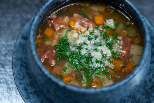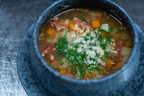 Суп из бычьих хвостов с полбой и хреном