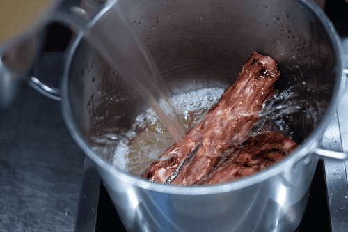 Хвосты обжарить на гриле или в духовке до корочки, залить куриным бульоном и томить в печи 12 часов при температуре 85 градусов или варить на плите в течение 4 часов.