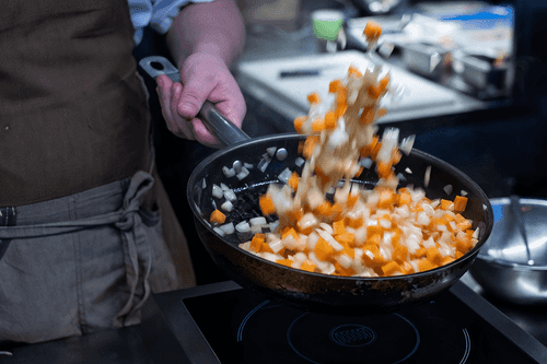 Все овощи нарезать кубиками со стороной 2 см, обжарить на сковороде до появления золотистой корочки, добавить в бульон.