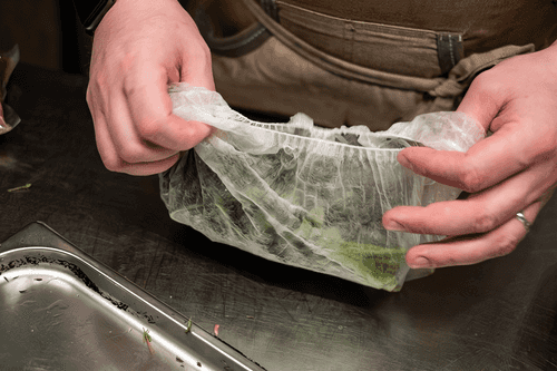 Петрушку, тимьян и чеснок положить в сеточку для специй или марлю, завязать ее. Марлю опустить в бульон, проварить в бульоне, чтобы травы отдали весь аромат, затем удалить.