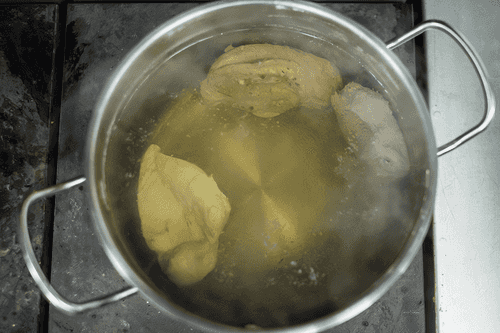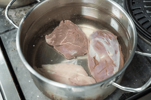 Залить мясо 2,5 литрами воды, довести до кипения и снять пену. Варить бульон примерно 6 часов на медленном огне, доливая воду по мере ее выпаривания. Затем снять бульон с огня, вынуть мясо и оставить его охлаждаться. Курица и говядина понадобятся для супа, а утку можно использовать в других целях, ее мясо на вид будет очень мягким, но на деле жестким, его очень трудно будет прожевать; никакой ценности оно в супе представлять не будет.