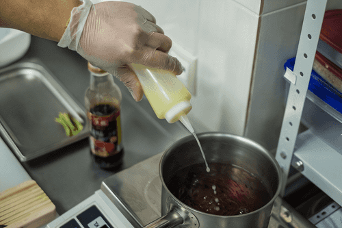 Аккуратно залить конструкцию 300 мл холодного бульона, украсить веточкой кинзы и парой долек красного перца чили. Подавать суп с тремя соусами на выбор: горчицей, соевым соусом и рисовым уксусом.