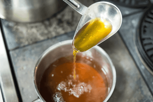 В результате бульон поменяет цвет со светло-желтого на насыщенный янтарный. Поставить его в холодильник на 2 часа. Если на поверхности после пребывания в холодильнике образуется жирная корочка, снять ее.