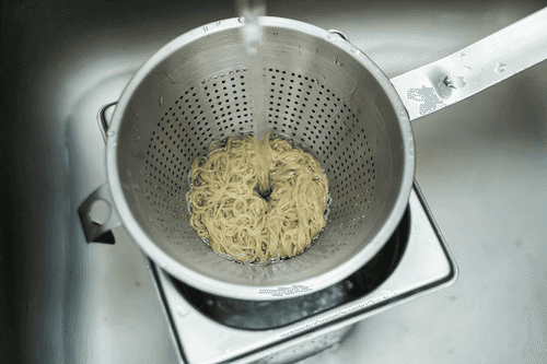 Отварить гречневую лапшу. Отваренную лапшу обязательно промыть под проточной холодной водой. Это нужно, чтобы остановить процесс термической обработки внутри продукта.