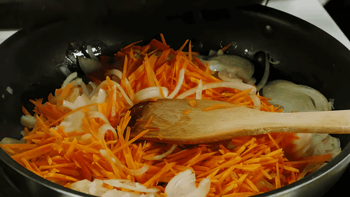 Пока лук жарится, нарезать соломкой 2 средние моркови, добавить к луку и обжарить.