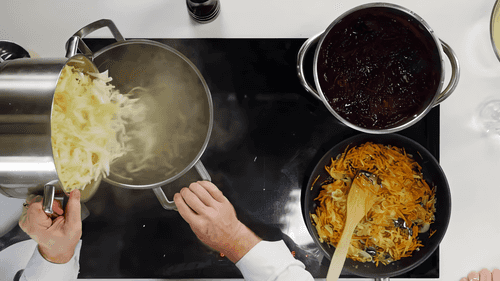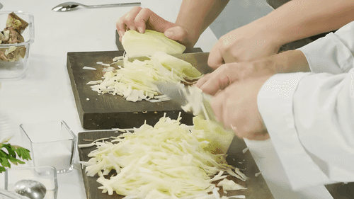 Нарезать капусту соломкой. Ошпарить, чтобы она отдала капустный дух.