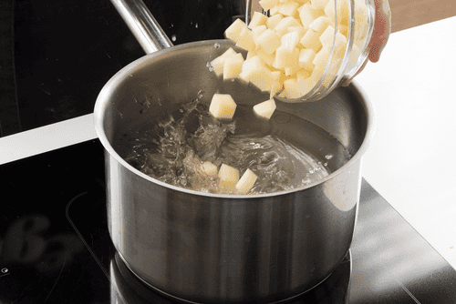 Картофель почистить, нарезать кубиком и сварить в 2–2,5 литрах воды.