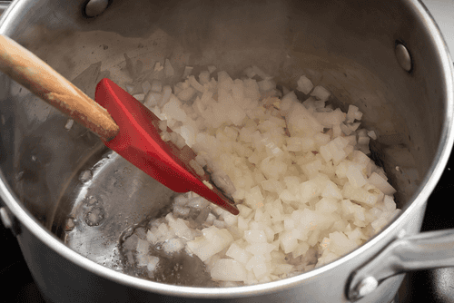 Лук и чеснок мелко порубить. Разогреть прямо в кастрюле растительное масло и обжарить лук и чеснок до прозрачности.