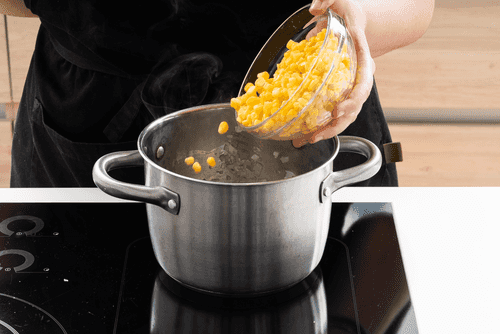 Выложить в сковороду кукурузу и готовить на небольшом огне 5–7 минут.