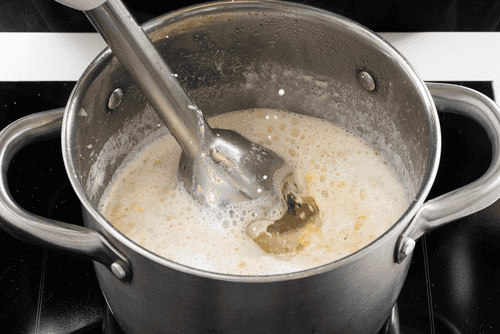Влить в кастрюлю молоко, варить 10–15 минут на среднем огне, посолить, поперчить.