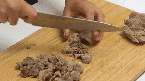 Спустя 2 часа процедить бульон, мясо нарезать средним кубиком, избавив его от кости.