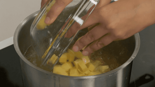 Процеженный бульон довести до кипения, добавить к нему картофель, нарезанный средним кубиком, и варить 10 минут.