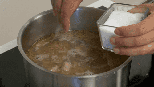 Мясо залить холодной водой, довести до кипения и снять пенку с поверхности. Понизить огонь, добавить луковицу, морковь, лавровый лист и душистый перец, варить 2 часа.