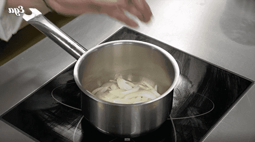 На сильном огне в кастрюле разогреть сливочное и оливковое масло. Выложить лук и пассеровать, помешивая, 10–15 минут, только чтобы он стал прозрачным и отдал влагу, но не поджарился.
