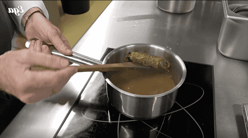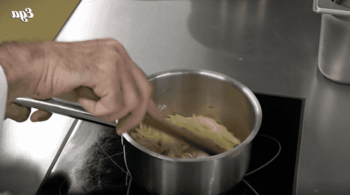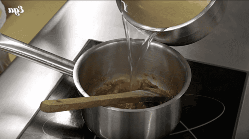 Добавить белое вино и дать ему выпариться на ¾ объема. Затем добавить бульон.