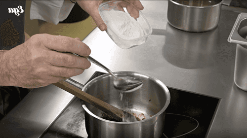 Присыпать лук мукой, размешать и оставить его томиться еще минут на пять.