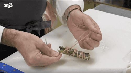 Обернуть 2 веточки тимьяна в лавровый лист как сигарету, это будет букет гарни. Положить букет гарни в кастрюлю. Посолить. Варить суп на медленном огне около часа.