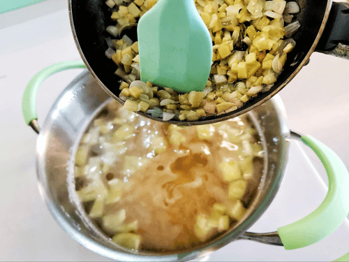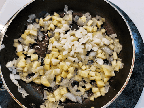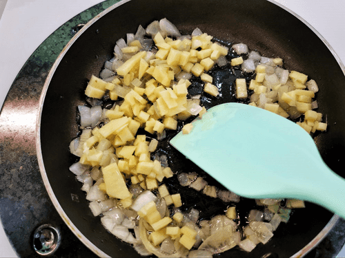 Нарезать лук и объединить его с имбирем в кипящем масле на сковороде и обжарить до легкого румянца.