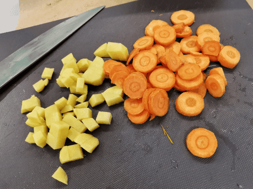 Морковь и картофель почистить и нарезать кружочками и кубиками.