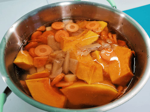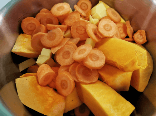 Тыкву очистить от кожуры и отправить в кастрюлю. К ней же выложить морковь и картофель.
