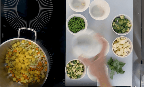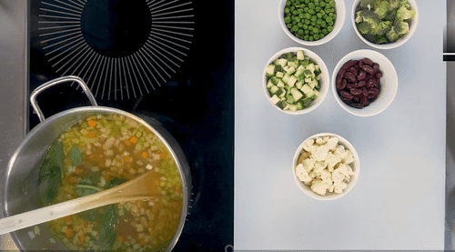 Спустя 45 минут после начала варки добавить в суп цветную капусту, цукини, брокколи, зеленый горох и красную фасоль. Варить 10 минут на среднем огне. Если суп покажется слишком густым, добавить 250 мл воды.