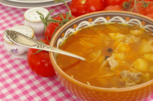 Нарезать картофель кубиками, всыпать в бульон, добавить пшено и половинку сырой луковицы. Варить пятнадцать минут.