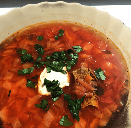 Борщ украинский – это душевное и сытное блюдо, укоренившееся в традициях восточнославянской кухни. Его глубокий рубиновый цвет придаёт свёкла, которая также наполняет борщ лёгкой кислинкой, гармонирующей с мясным бульоном и ароматными специями. Вкус борща – насыщенный, многослойный, с нежными овощными нотами и приятной густотой. Заправленный чесночным салом и сметаной, он становится ещё более бархатистым. Борщ – не просто суп, а символ домашнего уюта, семейных обедов и гостеприимства. Его готовят в каждом украинском доме, он согревает в холода и радует вкусом в любое время года. Настоящий борщ требует времени и терпения, ведь его насыщенность и глубина вкуса раскрываются особенно ярко после настаивания.
