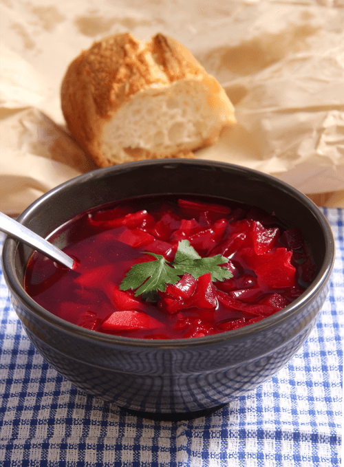 В прозрачный бульон (мясной, куриный или из дичи) за 10-15 минут до окончания варки добавить тонкие ломтики очищенной красной свеклы, уксуса и немного сахара.