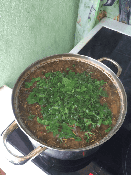 Кладем в суп хмели-сунели, соль, перец, доводим до кипения и варим еще минут пять. Когда разливаем суп по тарелкам, то добавляем разную зелень.