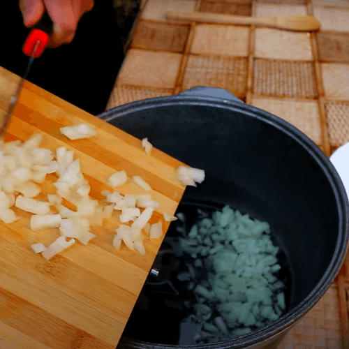 Кубиками нарезать морковь и через 2 минуты добавить к луку.
