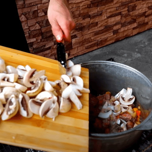 Свежие шампиньоны нарезать крупно. Это даст немного жидкости и аромата блюду. Сок пропитает мясо. Обжаривать не больше 5 минут.