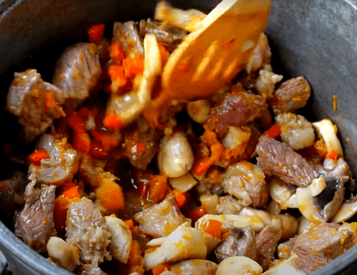 Филе говядины нарезать очень мелко и отправить обжариваться с тыквой и другими овощами в течение 25 минут с регулярным перемешиванием.