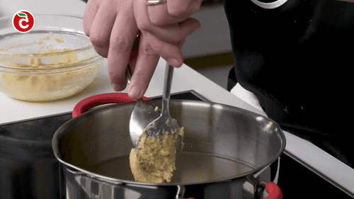 Двумя ложками сформовать кнедлики и бросить в некипящий бульон. Варить несколько минут, пока кнедлики не всплывут.