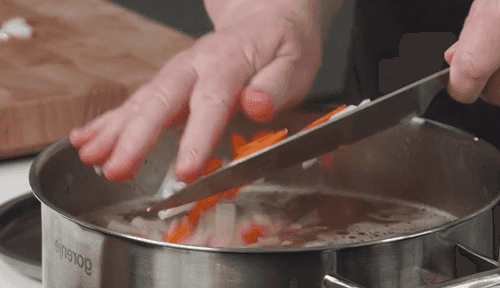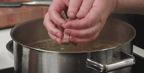 Из мяса, 1 моркови, 1 луковицы и стебля сельдерея сварить бульон. После закипания обязательно снять пену, затем понизить огонь и варить 2–3 часа. Когда бульон будет готов, достать шумовкой вареные овощи и мясо.