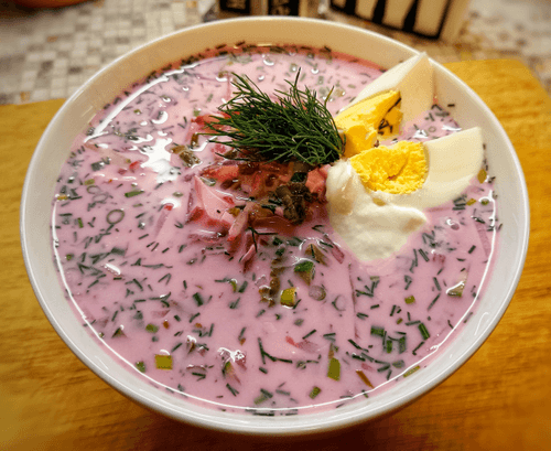 Холодник по-белорусски со свеклой и щавелем — это освежающий летний суп, который уходит корнями в кулинарные традиции Беларуси. Он вобрал в себя лучшие ингредиенты сезона: сочную свеклу, ароматный щавель, хрустящий редис и огурцы. Суп обладает удивительно ярким вкусом, сочетающим легкую кислинку щавеля, сладость свеклы и кремовую мягкость кефира. Белки и желтки придают блюду насыщенность, а зелень — свежесть. Исторически холодные супы в восточноевропейской кухне служили спасением в жаркие летние дни. Холодник не только утоляет жажду, но и насыщает, оставаясь легким. Подается традиционно хорошо охлажденным, иногда с добавлением сметаны или отварного картофеля. Это истинное воплощение летней прохлады на тарелке.