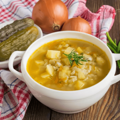 Рассольник — традиционный русский суп, известный своей насыщенной кисло-соленой ноткой, благодаря соленым огурцам и рассолу. Его история уходит в глубь веков, когда соления использовались для сохранения продуктов и придания блюдам особого вкуса. Этот сытный и согревающий суп готовится на основе мясного бульона, обычно из говядины, с добавлением перловки, которая делает текстуру нежной и плотной. Овощи, такие как морковь, картофель и лук, придают легкую сладость, а чеснок и зелень дополняют ароматную композицию. Рассольник идеально подходит для холодных дней, помогая восстановить силы и насытиться. Подается со сметаной, что смягчает его насыщенный вкус, и свежей петрушкой, придающей легкую свежесть. Это блюдо не просто суп, а символ домашнего уюта и традиций русской кухни.