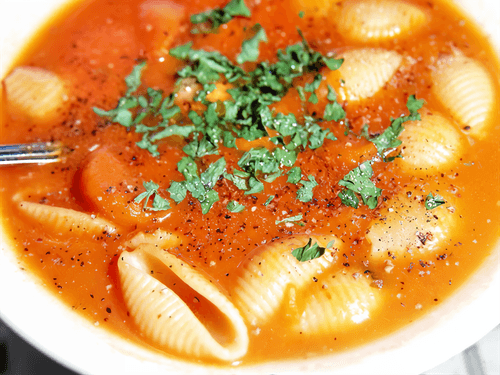 Суп заправить маслом и сливками, добавить макароны, отваренные в воде и нарезанные кусочками длиной 0,5 см. Отдельно подать тонкие гренки, посыпанные сыром и подрумяненные в жарочном шкафу.