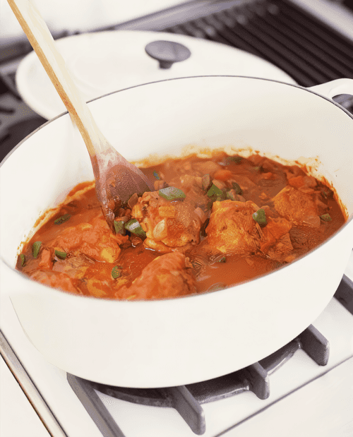 Добавить курицу и специи в кастрюлю, обвалять курицу в соусе. Снизить огонь, накрыть и готовить, помешивая, примерно 1 час, пока курица не будет готова. Добавить еще немного жидкости, если смесь кажется слишком густой.