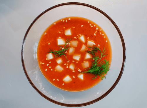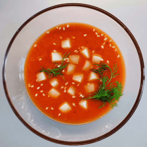 Томатный суп на курином бульоне — это гармония вкусов, в которой сочетаются пикантность специй, насыщенность бульона и свежесть томатов. Корни этого блюда уходят в глубину кулинарных экспериментов, создавая авторский рецепт с ярким характером. Его мягкая текстура обогащена нежной сливочной моцареллой, а аромат свежего имбиря и чили придает ему теплую остроту. Такой суп идеально подходит как согревающий обед или легкий ужин, особенно в прохладное время года. Он не только питателен, но и бодрит благодаря насыщенному вкусовому ансамблю, а кунжут и зелень придают финальный штрих изысканности. Это блюдо прекрасно сочетается с хрустящими тостами или свежим хлебом, создавая завершенный гастрономический опыт.