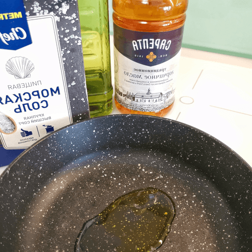 В глубокой сковороде с толстым дном смешать оливковое и горчичное масло, добавить 2 щепотки крупной соли.