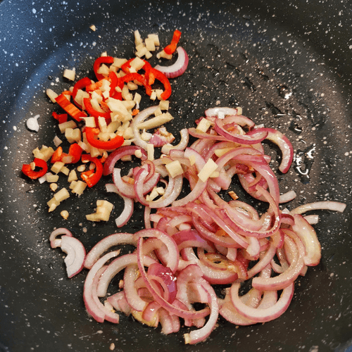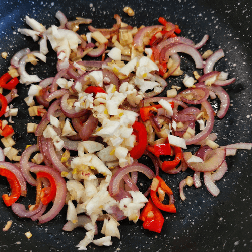 Через 30 секунд перемешать, добавить чили и имбирь.