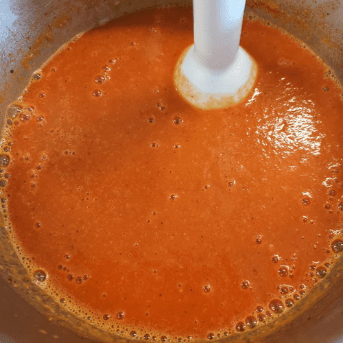 Как только суп достигнет высокой температуры (не доводить до кипения), снять с огня и интенсивно взбить погружным блендером до однородной консистенции. Досолить по вкусу.