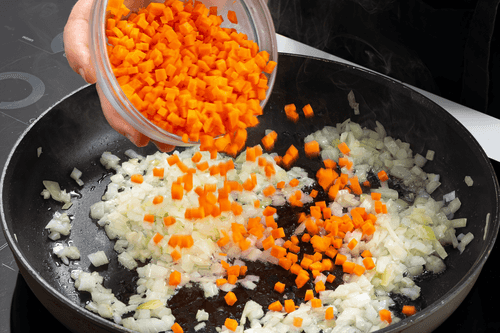 Обжаривать лук и морковь на растительном масле, пока лук не приобретет золотистый оттенок.